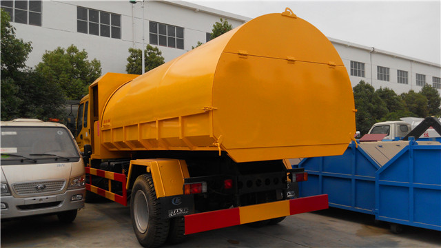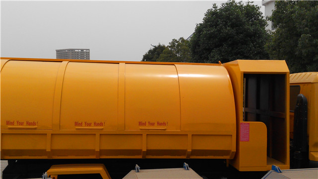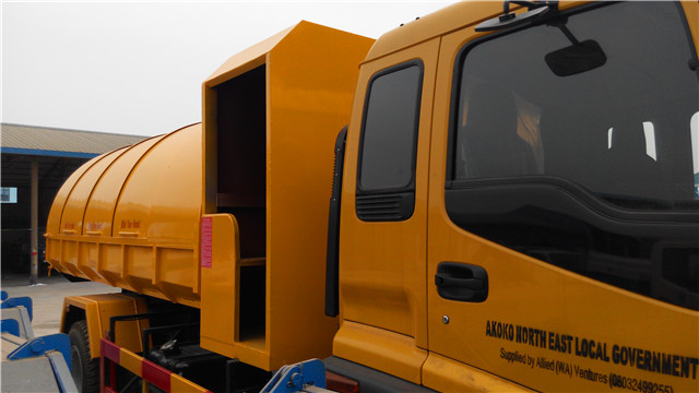 該車是尼日利亞用戶在實地考察了我廠后定購的,該車根據(jù)用戶的實際使用環(huán)境經(jīng)過了特殊設計:密封垃圾箱設計成了橢圓形,便于雨水流走,另外,根據(jù)實際使用需要,在垃圾斗的前面還設計有一個乘人間,便于垃圾清運人員的乘坐。