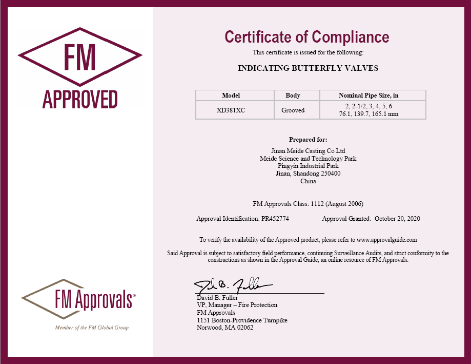 MEIDE GROUP obtains FM approval for Butterfly Valve with Normally Closed Tamper Switch(XD371XG, XD371XLG,XD381XG).