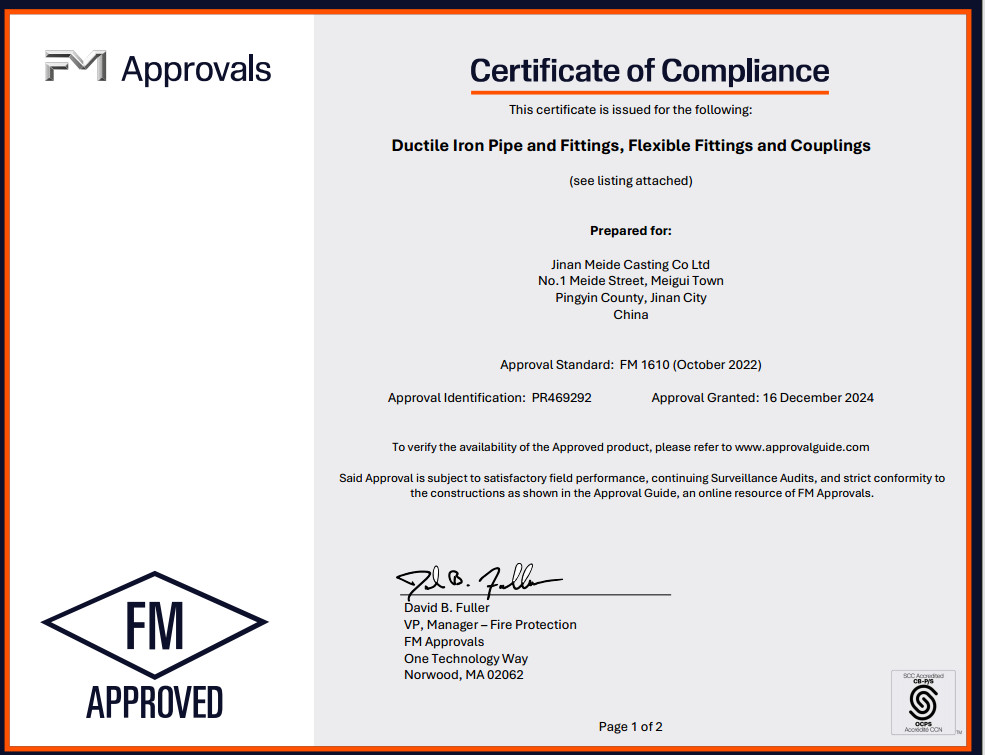 Meide Ductile lron Pipe and Fittings, Flexible Fittings and Couplings has been approved by FM