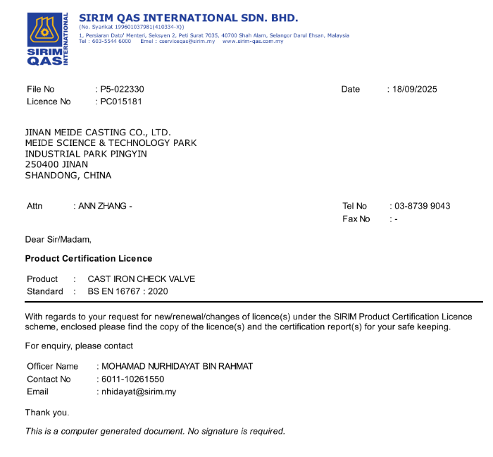 Meide Group's gate valves, butterfly valves, and check valves have obtained SIRIM certification