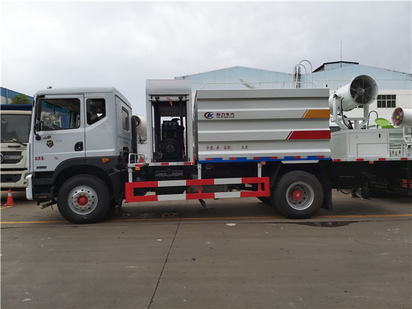 國六D9多功能抑塵車主要由發(fā)動機(jī)帶動變速箱,變速箱上安裝的取力器帶動灑水泵,灑水泵產(chǎn)生動力,將罐體內(nèi)部的液體通過管網(wǎng)噴灑出去。工作范圍:自吸高度:≤7m,灑水寬度:≥14m,最大射程:≥28m;可調(diào)節(jié)成柱狀,射程≥28m;也可調(diào)節(jié)成霧狀,射程≥5m。