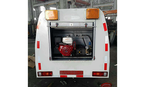 該車輛型號CLW5020GQXC4,選用的是解放汽油機底盤2.75米軸距,清洗水箱的容積1.2立方米。車輛前端有一排帶有10個高壓沖頭前沖器,車子選配意大利進口的高壓泵,壓力達到10兆帕,該車是用于清洗路面,路面的保潔養(yǎng)護,比如臨街餐飲路面上的油漬,城區(qū)路面因轉(zhuǎn)運泥土車的撒漏使泥土粘貼在路面上,以及其他較強力的路面附著物的清洗處理都需要使用該車,除污效果好,省時省力。