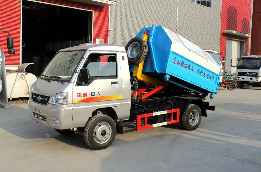 掛桶式垃圾車:垃圾斗固定在車身,可翻起自卸。在車廂一側有提升機,可將垃圾桶掛上自動倒入垃圾箱內。垃圾桶放在路邊或小區,隔一段距離放一個,可放240升350升的塑料桶。