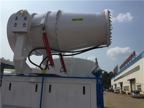 在常規灑水車的基礎上,加裝了抑塵噴霧系統,外接的380V配套動力組把罐體內的水霧最大霧化作業行程高達20-100米,穿透性好,作業效率高,大大降低了勞動力成本??蓪γ憾褔姙⒁謮m劑、固化劑,使得煤灰不會被風吹起,降低空氣粉塵污染。采用了遙控操作指揮系統,可360度旋轉,兼具綠化噴灑,消防應急,除塵降塵,噴藥消毒等功能,遠程遙控,使用方便。