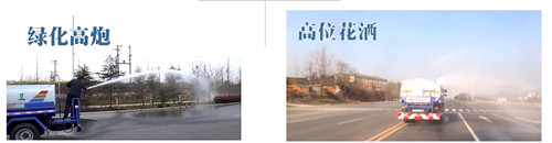 灑水車前裝有鴨形噴嘴或圓頭沖嘴,后面裝有圓柱開灑水噴嘴或蓮蓬頭噴嘴,后部有一工作平臺,裝配有水炮。后部還可裝8個(gè)噴嘴(選裝)噴水器一般用于沖洗街道,起除塵和降溫作用,其噴水器可以用調(diào)節(jié)噴嘴螺紋的方法改變噴水器的噴灑方向和角度,高射水炮可以用于城鄉(xiāng)園林綠化及應(yīng)急消防。蓮蓬嘴可以澆落路中間噴水器沖起的灰塵,起到清潔空氣的作用。