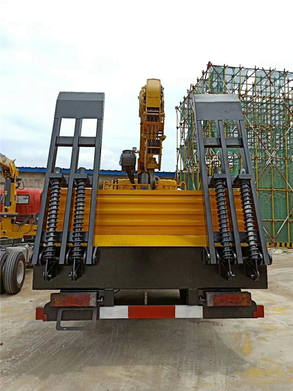 東風隨車吊可采用東風后雙橋底盤,齊心新款駕駛室佩帶氣囊座椅,電動升降玻璃,電動液壓升降駕駛室,方向助力,斷氣剎,abs防抱死,玉柴240馬力和玉柴270馬力國五發動機,10.00R20鋼絲胎,5噸前橋東風德納10噸雙后橋,懸掛也采用重載設計,保證承載性能。法士特小8檔變速箱,外形尺寸10450,9980×2500×3200(mm),總質量25噸上戶噸位13噸車身自重10.9噸,。標準型上裝橫梁采用12*12規格6mm厚方鋼,整根貫穿式設計,保證承載性能,貨箱平板8mm厚花紋板;重載型上裝橫梁采用12*10規格8mm厚方鋼,整根貫穿式設計,承載性能更好,貨箱平板8mm厚花紋板,爬梯采用重載加強型設計,采用三道筋雙簧加固處理,帶有后支腿,平板帶有斜支撐,貨箱平板可以伸縮,伸出3米,縮回2.5米,貨箱平板長度8米,是運輸20噸-30噸大型貨物、大型工程機械等最理想的隨車吊。
