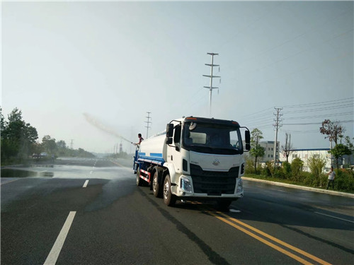 灑水車專用性能:具有前沖后灑、側噴(更換噴頭后變為側花灑)、后置式工作平臺(帶踏梯,四周有安全護欄)、平臺上設置有高壓水炮(可360°旋轉,可調成柱狀,也可調成霧狀,可調成:直沖狀、大雨、中雨、小雨、毛毛雨)。配備全國評比第一的杭州威龍專用灑水泵,選億豐泵或金龍泵,雜物過濾網,國標通用65型消防接口(可通過消防栓加水)、1套自流球閥系統(可自吸自排),2根引水鋼絲膠管(帶陰陽快速接頭),水位計。
