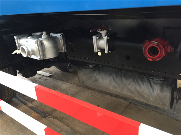環衛灑水車罐體頂端有一個專門用于加水和人工進入罐體內的人口孔,打開人口孔就可以在取水樁上進行取水。前提是必須事先規劃地點和建設取水樁,避免在人流車流較大的位置設立,取水樁外觀呈門型,一端是垂直于地面的水管,高度一般為4.5米,再加一根90度呈伸出狀態的水管,在頂端加一個彎頭,視水管粗細附加防噴濺的軟管就可以了。這樣環衛灑水車取水時只需將車開至水樁下,打開水罐頂部的人口孔,使出水口與進水品盡量垂直,再打開水閥即可進行取水作業。