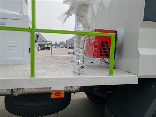 保溫帶加熱抑塵車與普通抑塵車最大的區別,就在于水罐體外多加了一道保溫層。保層溫的制作就是在水罐外部另外焊接10mm厚的支撐骨架,然后用保溫材料將骨架內部填充滿,最后在骨架外蒙上一層外皮。在罐體內加了好加熱管。
