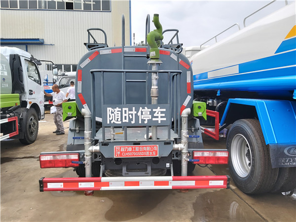東風(fēng)灑水車前裝有鴨形噴嘴或圓頭沖嘴,后面裝有圓柱開灑水噴嘴或蓮蓬頭噴嘴,后部有一工作平臺,裝配有水炮。后部還可裝8個噴嘴(選裝)噴水器一般用于沖洗街道,起除塵和降溫作用,其噴水器可以用調(diào)節(jié)噴嘴螺紋的方法改變噴水器的噴灑方向和角度,高射水炮可以用于城鄉(xiāng)園林綠化及應(yīng)急消防。蓮蓬嘴可以澆落路中間噴水器沖起的灰塵,起到清潔空氣的作用。
