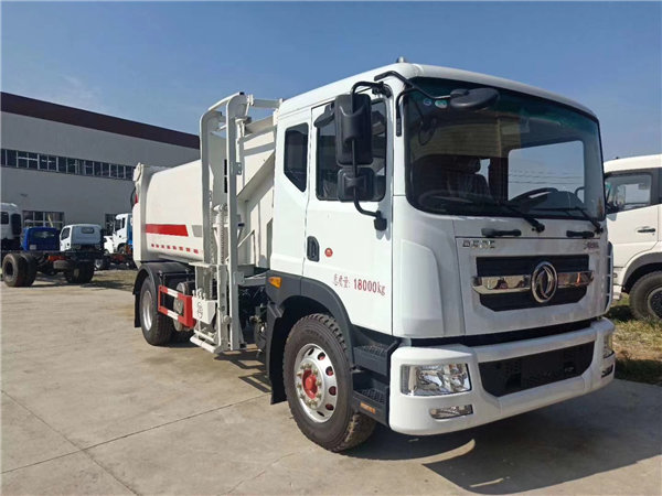 東風多利卡D9后裝餐廚式垃圾車,搭配康明斯180馬力國五發動機,法斯特八檔箱,10.00R20鋼絲胎,軸距4500mm,原廠空調,正規東風GB7258-2017新規底盤;上裝采用Q345高強度錳鋼板制作,廂體容積:12.8立方米,可裝32立方散裝垃圾,大流量液壓泵,大流量手自一體多路換向閥,可編程PLC電控系統帶無線遙控器操作系統,雙污水廂,雙向壓縮,卸料時帶一鍵循環系統,司機不下車可完工卸料工作。尾部選裝翻擺臂斗機構,選裝遙控器操作。