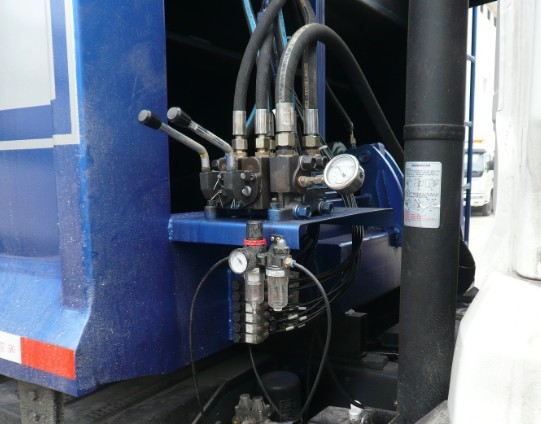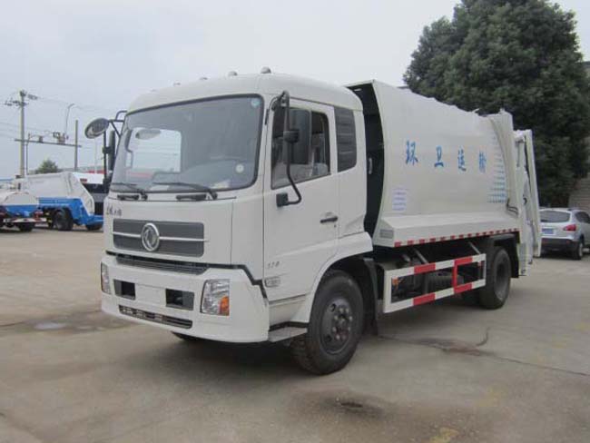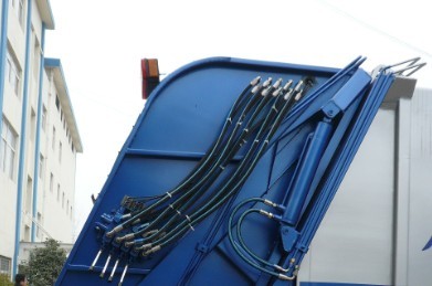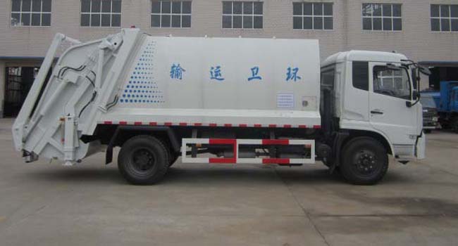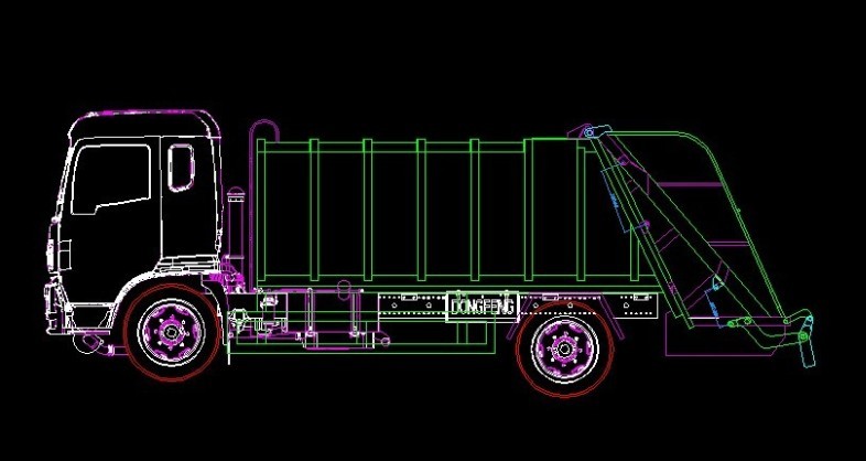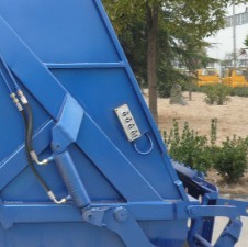 壓縮機構(主壓板,副壓板,刮板,推板等),掛筒機構等。主體結構簡圖如下: 其工作原理為:人工將垃圾裝入料槽中啟動刮板機構將垃圾從料槽中刮升至于箱體水平位置,再通過副推板將垃圾推向箱體車頭的位置。當垃圾裝至3立方左右時啟動副壓板機構將箱體內的壓力進行壓實處理。同時主推板也相應的配合使用在將垃圾壓實的過程中使得垃圾內的廢液通過箱體內的導流槽流入料槽中,再通過料槽左右兩端的出液口將廢液排除。在卸料過程中,首先將副推板整體整體提升至卸料狀態,再啟動主推板將壓縮后的垃圾從箱體內推出,從而完成一整套裝卸過程。湖北程力專用汽車有限公司所生產的掛架式垃圾車,其中的掛架機構主要是為了節省人工成本降低生活垃圾隊環衛工人的身體危害。該掛架機構可懸掛220升及600升兩種城市通用移動式塑料垃圾收集筒。整體效果圖如下: