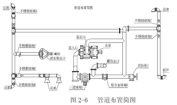 在灑水和澆灌花木時,其操作程序是:調節三通球閥G到如圖位置(注意:三通球閥凹坑所對方向關閉),關閉鋁合金球閥H和消防栓I,打開不銹鋼球閥A、B、C、D、E,打開鋁合金球閥H,踏下離合,打開取力器開關,慢慢松開離合(千萬不可過快,否則將會損壞取力器或變速箱),使水泵開始工作,即可向實現灑水和澆灌花木的功能,停止工作后開關
