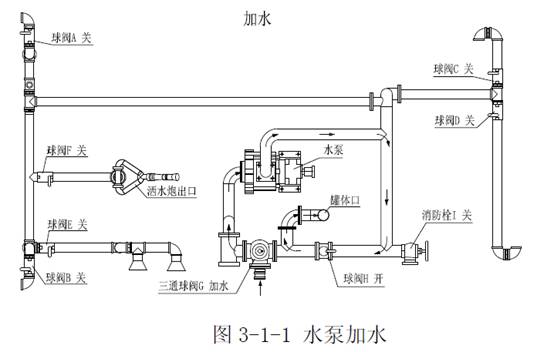 當在野外自采水的情況下,水能通過水泵給罐內供水,其操作程序是:在三通球閥G處接一膠管,調節三通球閥G到如圖位置(注意:三通球閥凹坑所對方向關閉),關閉不銹鋼球閥A、B、C、D、E、F和消防栓I,打開鋁合金球閥H,踏下離合,打開取力器開關,慢慢松開離合(千萬不可過快,否則將會損壞取力器或變速箱),使水泵開始工作,即可向罐內加水,停止工作后開關回位。