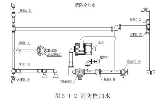 工作水路示意:水經過消防栓開關I、鋁合金球閥H、水罐。(其中A、B、C、D、E、F、G、H關閉)。