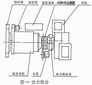 動力組合由散熱器、副發動機、液力偶合器、皮帶傳動裝置、風機組成。為清掃作業提供動力源。動力組合通過副框架固定在底盤大梁上。