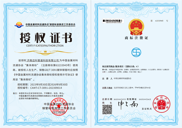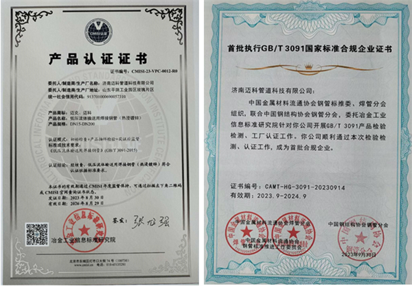 為了促進企業(yè)規(guī)范經(jīng)營,維護國標(biāo)產(chǎn)品形象和合規(guī)企業(yè)公信力、競爭力,保障用戶合法權(quán)益,2023年3月15日,由中國金屬材料流通協(xié)會焊管分會牽頭,聯(lián)合中國鋼結(jié)構(gòu)協(xié)會鋼管分會、冶金工業(yè)信息標(biāo)準(zhǔn)研究院及國內(nèi)主要焊管企業(yè),正式啟動了行業(yè)首個自律規(guī)范組織——中國金屬材料流通協(xié)會鋼管標(biāo)準(zhǔn)推進工作委員會(簡稱“中金協(xié)鋼管標(biāo)推委”),隨后組織開展了GB/T 3091-2015產(chǎn)品認證工作。2023年10月16日,由四大權(quán)威機構(gòu)聯(lián)合發(fā)布的首批入圍《執(zhí)行GB/T 3091國家標(biāo)準(zhǔn)合規(guī)企業(yè)名錄》的14家企業(yè)中,濟南邁科管道科技有限公司成為首批執(zhí)行GB/T3091國家標(biāo)準(zhǔn)并獲得鋼管標(biāo)推委認證合規(guī)企業(yè)之一,同時獲得中國金屬材料流通協(xié)會授權(quán)使用“STS(鋼管標(biāo)準(zhǔn))”集體商標(biāo)。
