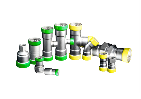 薄壁碳鋼單卡壓管件及管材,相較于普通螺紋連接,碳鋼單卡壓每百噸管材可減少碳排放210噸,主要應用于燃氣和消防領域;