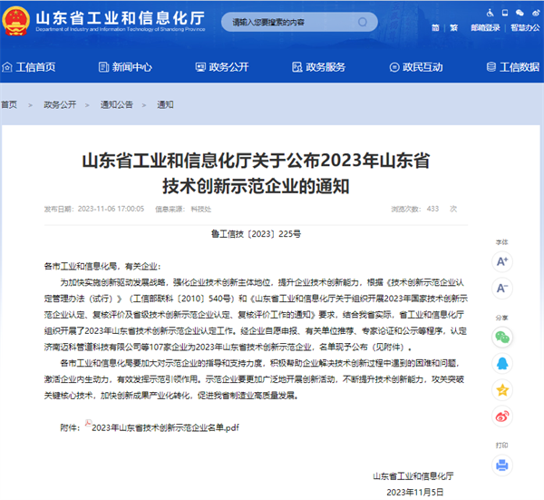 2023年11月6日,山東省工信廳網(wǎng)站公布了《山東省工業(yè)和信息化廳關(guān)于公布2023年山東省技術(shù)創(chuàng)新示范企業(yè)的通知》。經(jīng)企業(yè)自愿申報、有關(guān)單位推薦、專家論證和公示等程序,認(rèn)定濟(jì)南邁科管道科技有限公司等107家企業(yè)為2023年山東省技術(shù)創(chuàng)新示范企業(yè),名單現(xiàn)予公布。