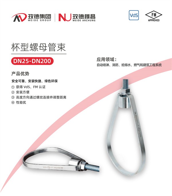 杯型螺母管束,用于管道的連接,用來固定管道的位置,適配美標及歐標鋼管。螺母連接到螺紋配件上,螺紋配件再連接到建筑或者鋼梁上。可以在垂高度方向上進行調整,螺桿必須完全旋入接頭內(nèi),以確保達到預定承載力,推薦使用在自動噴淋、消防、給排水、燃氣和建筑工程系統(tǒng)。