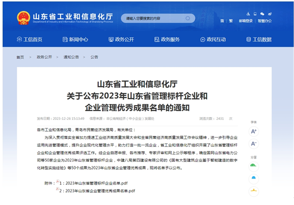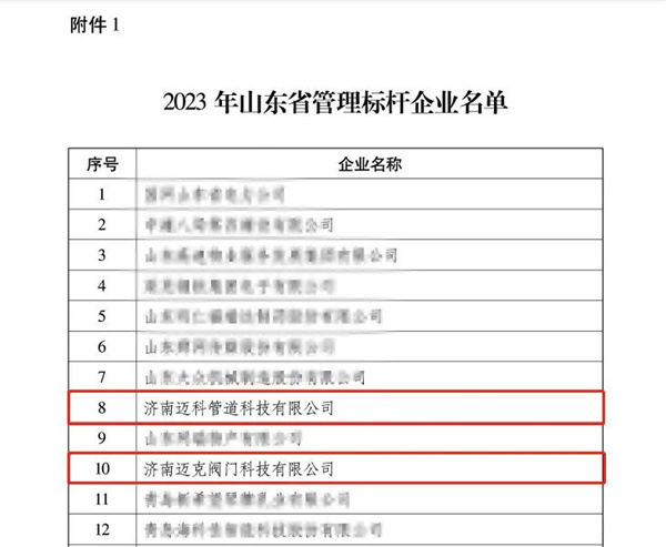 2023年12月25日山東省工業(yè)和信息化廳發(fā)布《關(guān)于公布2023年山東省管理標(biāo)桿企業(yè)和企業(yè)管理優(yōu)秀成果名單的通知》,公布玫德集團(tuán)旗下濟(jì)南邁科管道科技有限公司、濟(jì)南邁克閥門(mén)科技有限公司均順利通過(guò)2023年山東省管理標(biāo)桿企業(yè)認(rèn)定。
