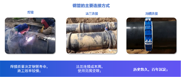 水利輸水管道安裝工程的重點(diǎn)是管材的選擇,長距離輸水管道管材的選用離不開鋼管,目前鋼管連接主要有焊接、法蘭連接和溝槽連接3種連接方式。