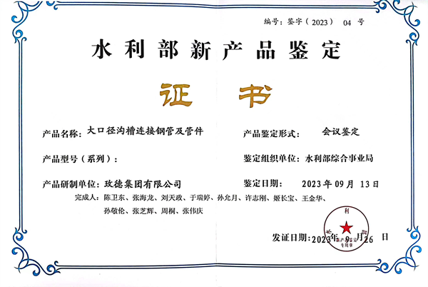 玫德集團(tuán)大口徑溝槽連接鋼管及管件產(chǎn)品得到了水利行業(yè)頂級(jí)專家的認(rèn)可,鑒定結(jié)論為:該產(chǎn)品加工技術(shù)及能力達(dá)到國際領(lǐng)先水平,產(chǎn)品達(dá)到國際先進(jìn)水平。得到了水利部領(lǐng)導(dǎo)及專家的一致認(rèn)可。