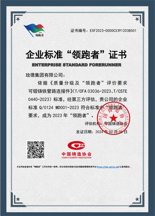 近日,2023 年全國企業(yè)標(biāo)準(zhǔn)“領(lǐng)跑者”名單發(fā)布,玫德集團(tuán)有限公司主導(dǎo)制定中國鑄造協(xié)會團(tuán)體標(biāo)準(zhǔn)《質(zhì)量分級及“領(lǐng)跑者”評價要求 可鍛鑄鐵管路連接件》(T/CFA 03036-2023、T/CSTE 0440-2023)標(biāo)準(zhǔn),經(jīng)第三方評估,玫德集團(tuán)有限公司制定的企業(yè)標(biāo)準(zhǔn)《可鍛鑄鐵管路連接件》 Q/0124 MD001-2023入選,榮登2023年企業(yè)標(biāo)準(zhǔn)“領(lǐng)跑者”榜單。企業(yè)標(biāo)準(zhǔn)“領(lǐng)跑者”標(biāo)識是用于標(biāo)注被評估為“領(lǐng)跑者”的企業(yè)標(biāo)準(zhǔn)所對應(yīng)的產(chǎn)品或服務(wù)的信息標(biāo)簽。
