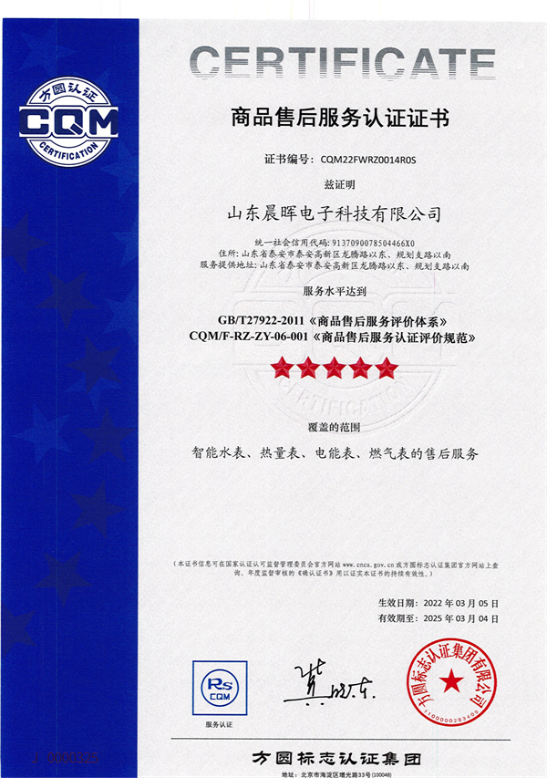 2024年3月25日,玫德集團旗下山東晨暉電子科技有限公司順利通過了商品售后服務認證審核。山東晨暉的智能水表、熱量表、電能表、燃氣表的售后服務水平已達到GB/T27922-2011《商品售后服務評價體系》及CQM/F-RZ-ZY-06-001《商品售后服務認證評價規(guī)范》。