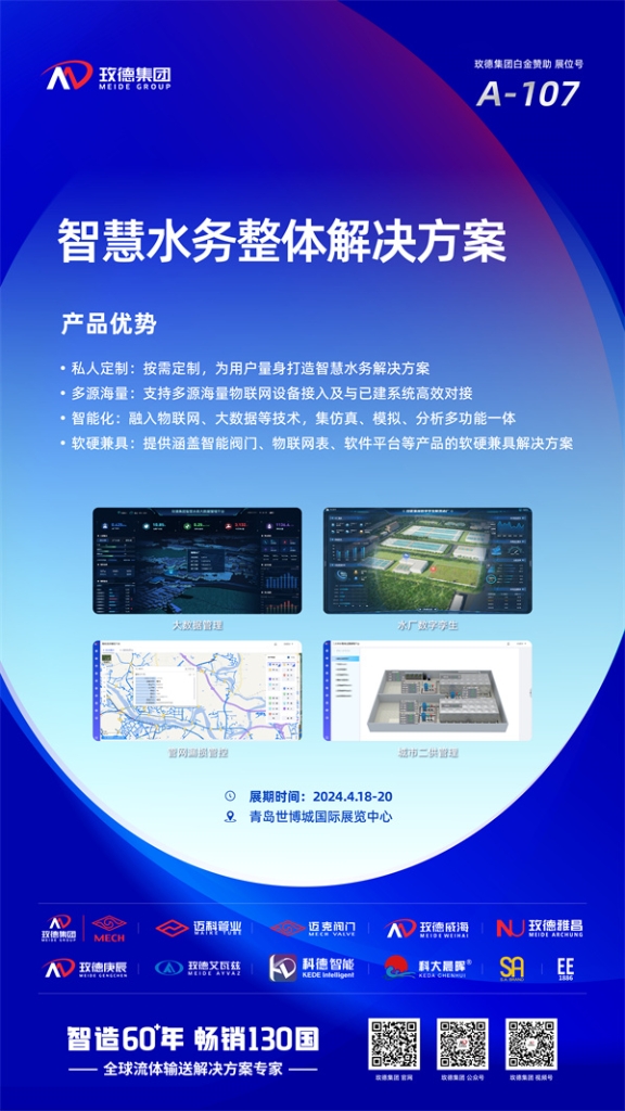 2024年4月18日-20日,玫德集團作為白金贊助商攜手中國水協在青島召開中國城鎮供水排水協會2024年會暨城鎮水務技術與產品交流展示會。屆時玫德集團會展出大口徑溝槽式鋼管及管件、科大晨暉智能儀表、水務領域智能閥門、不銹鋼管材管件、智慧水務整體解決方案等軟硬兼具的一站式產品及解決方案。