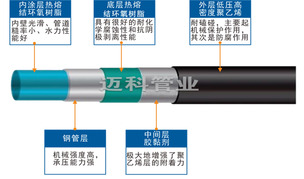 外壁采用熱熔結纏繞工藝,底層環氧樹脂、中間層膠黏劑、外層聚乙烯形成三層結構的防腐層。