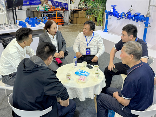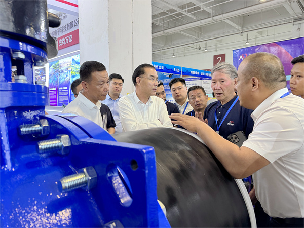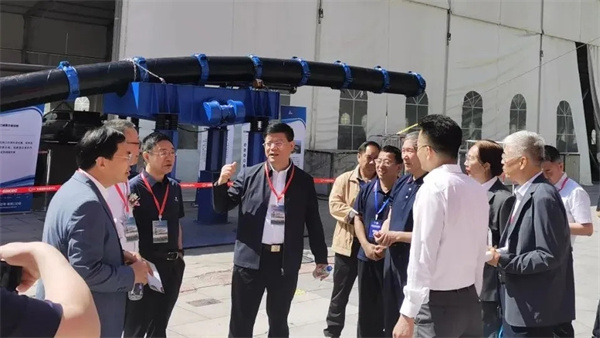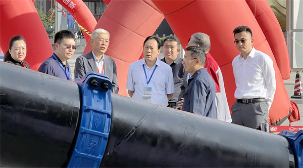 甘肅省水利廳廳長牛軍,甘肅省水利廳一級巡視員、省水利學會理事長吳天臨,甘肅省水利水電勘測設計研究院有限責任公司水利工程正高級工程師張東等蒞臨玫德集團展位參觀指導。參觀到大口徑鋼管柔性連接技術時,牛軍廳長講此技術解決了管道的很大難題,具有非常廣闊的應用前景。