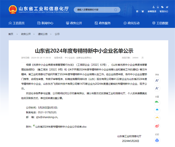 2024年5月28日山東省工業和信息化廳發布《山東省2024年度專精特新中小企業名單公示》通知,玫德集團旗下濟南邁克閥門科技有限公司、山東晨暉電子科技有限公司、臨沂玫德庚辰金屬材料有限公司、玫德集團臨沂有限公司順利通過2024年度山東省“專精特新”中小企業復核,玫德集團旗下信通科技(山東)有限公司首次通過2024年度山東省“專精特新”中小企業認定。