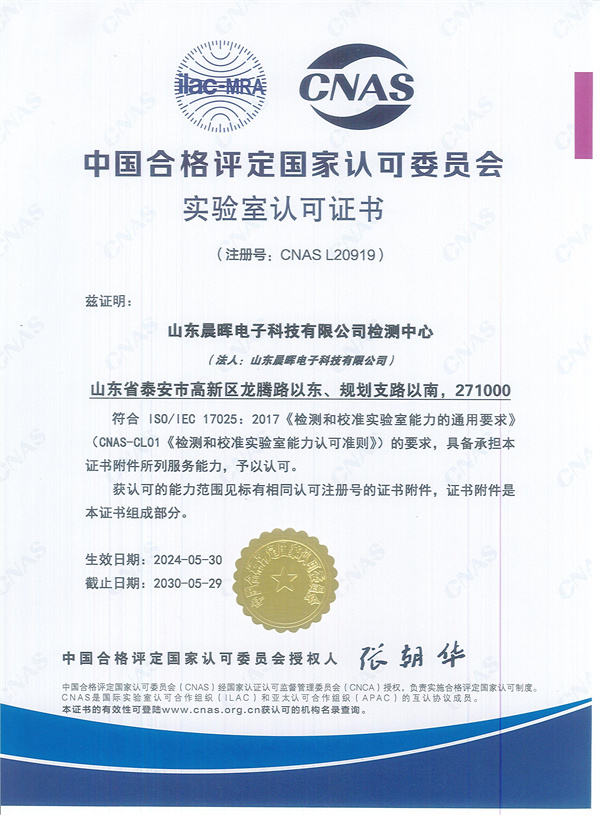 2024年6月5日,玫德集團旗下山東晨暉電子科技有限公司檢測中心順利取得CNAS實驗室認(rèn)可證書,并獲得國際互認(rèn)聯(lián)合認(rèn)可標(biāo)識,正式進入CNAS官方網(wǎng)站公布的獲得認(rèn)可的實驗室名錄。
