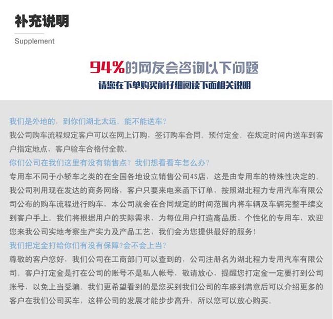 整車(chē)出具:正規(guī)底盤(pán)合格證、整車(chē)合格證、全國(guó)統(tǒng)一機(jī)動(dòng)車(chē)上戶(hù)發(fā)票、隨車(chē)工具,車(chē)輛保修手冊(cè)、使用說(shuō)明書(shū)、全國(guó)服務(wù)站名錄等。讓您上戶(hù)無(wú)優(yōu),方便、快捷、省心!